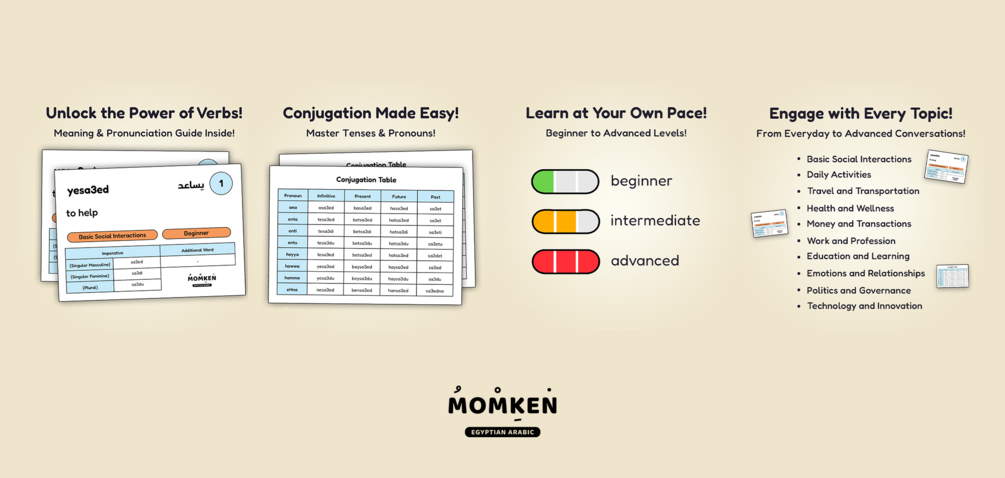 Unlock your Arabic fluency with Arabic in ACTION! This digital resource offers 250 essential Arabic verbs, carefully selected to guide learners step-by-step from beginner to advanced levels. Each verb is paired with translations, transliterations, and conjugation tables, making it practical and easy to use in real-world conversations.